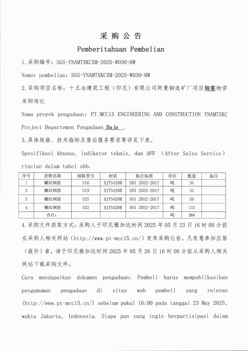 十五冶建筑工程(印尼)有限公司阿曼铜选矿厂项目钢筋物资采购询比 编号:SGS-YNAMTXKCXM-2025-W030-HW