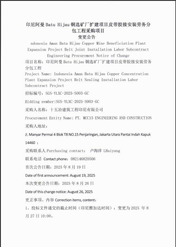 印尼阿曼BatuHijau铜选矿厂扩建项目皮带胶接安装劳务分包工程采购项目变更公告
