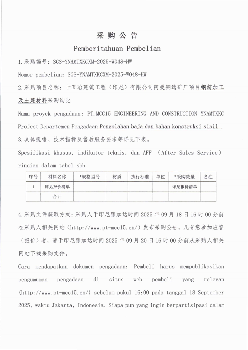 十五冶建筑工程(印尼)有限公司阿曼铜选矿厂项目钢筋加工及土建材料采购询比 编号;SGS-YNAMTXKCXM-2025-W048-HW