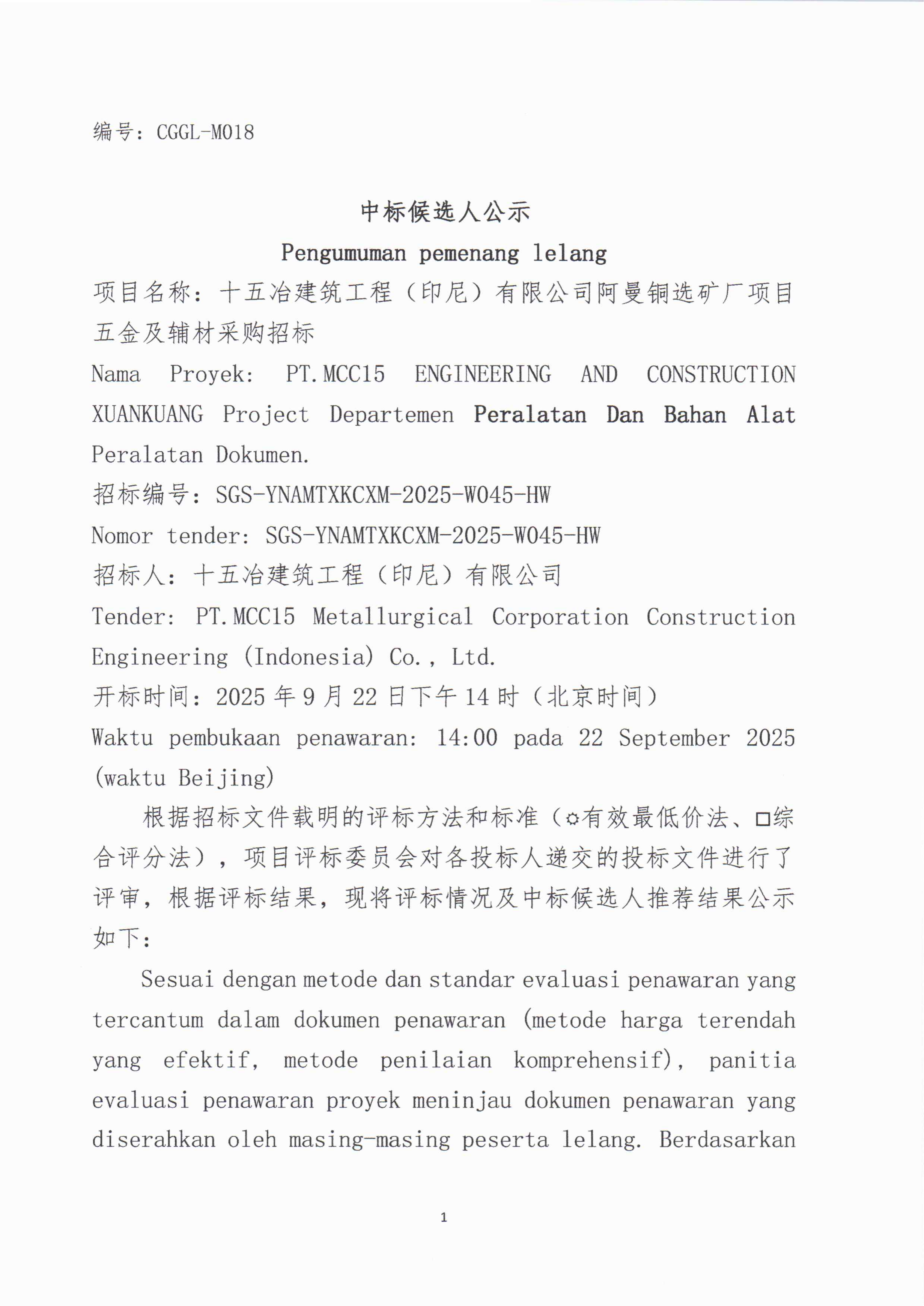 十五冶建筑工程(印尼)有限公司阿曼铜选矿厂项目五金及辅材采购招标中标候选人公示 编号:SGS-YNAMTXKCXM-2025-W045-HW