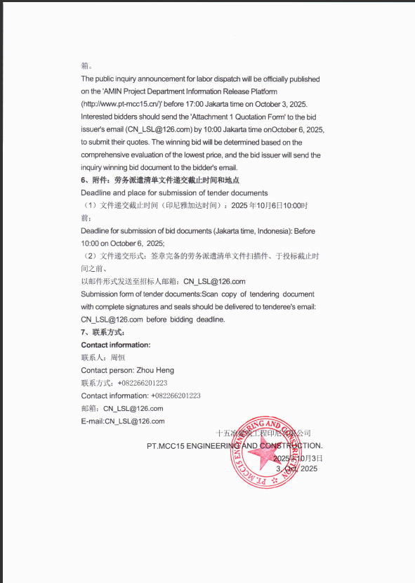 印尼阿曼Batu Hijau铜选厂扩建项目光纤熔接-劳务派遣公开询价公告