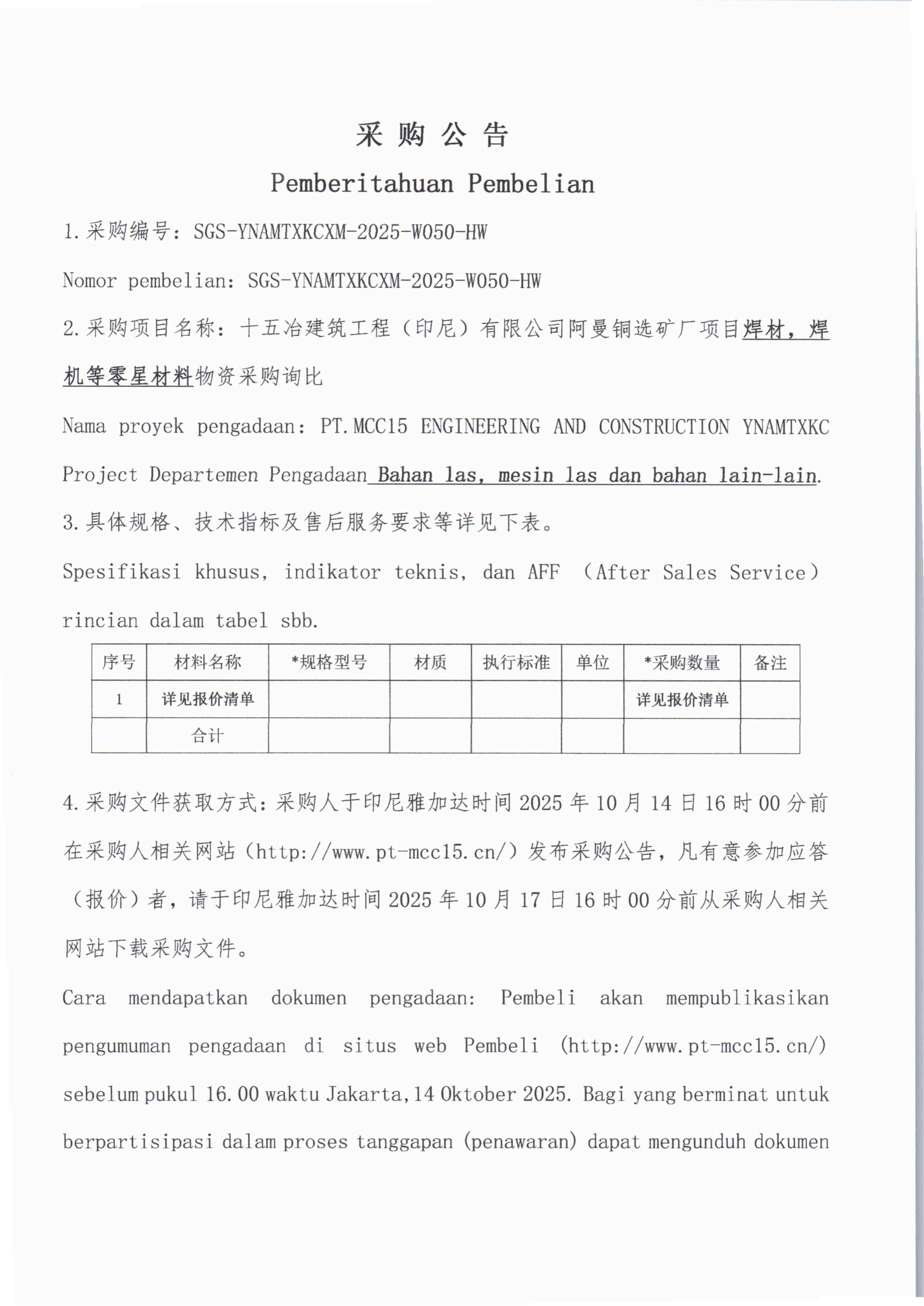 十五冶建筑工程(印尼)有限公司阿曼铜选矿厂项目焊材,焊机等零星材料采购询比 编号:SGS-YNAMTXKCXM-2025-W050-HW