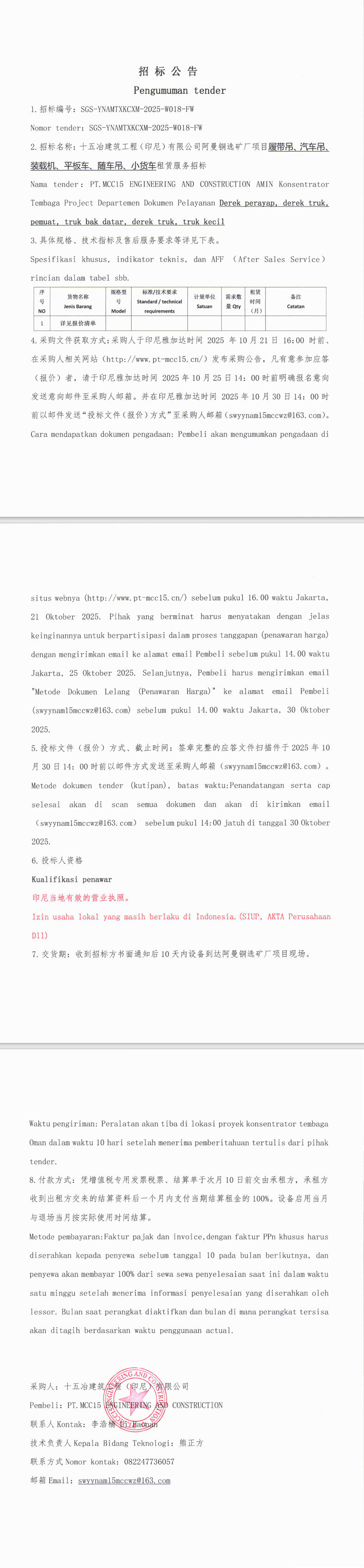 十五冶建筑工程(印尼)有限公司阿曼铜选矿厂扩建项目汽车吊、随车吊、平板车、装载机租赁服务招标 SGS-YNAMTXKCXM-2025-W018-FW