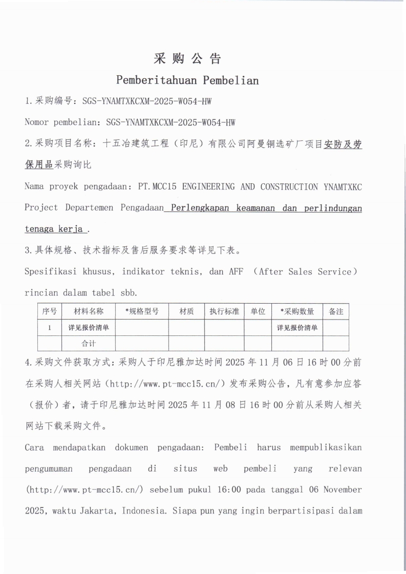 十五冶建筑工程(印尼)有限公司阿曼铜选矿厂项目安防及劳保用品采购询比 编号:SGS-YNAMTXKCXM-2025-W054-HW