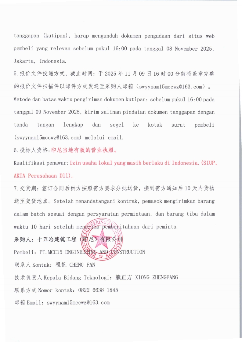 十五冶建筑工程 ( 印尼 ) 有限公司阿曼项目钢材采购询比公告