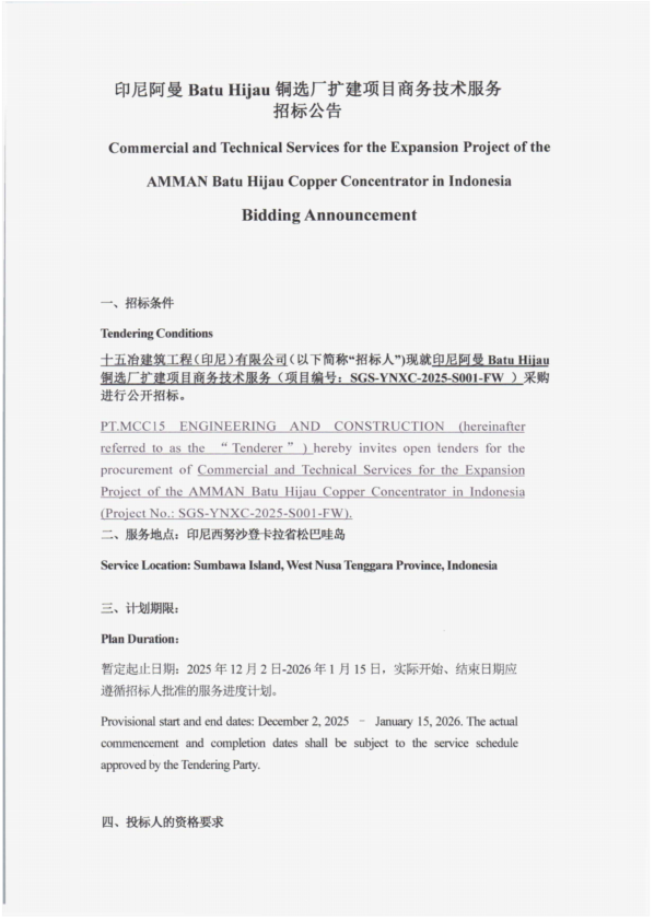 印尼阿曼 Batu Hiiau铜选厂扩建项目商务技术服务招标公告
