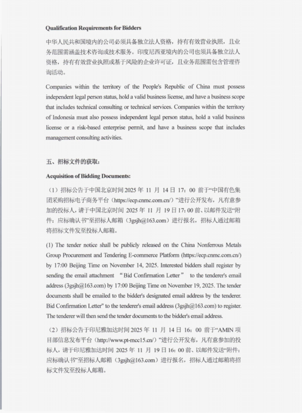 印尼阿曼90万吨年铜冶炼项目试验检测技术咨询服务中标结果公告