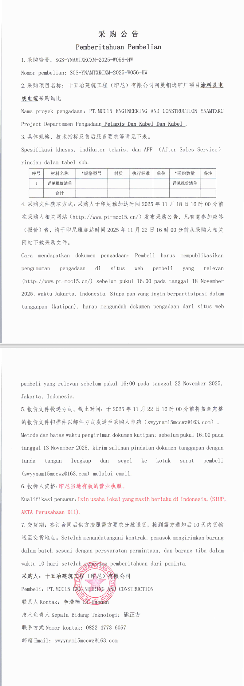 十五冶建筑工程(印尼)有限公司阿曼铜选矿厂项目柴机油采购询比 SGS-YNAMTXKCXM-2025-W056-HW