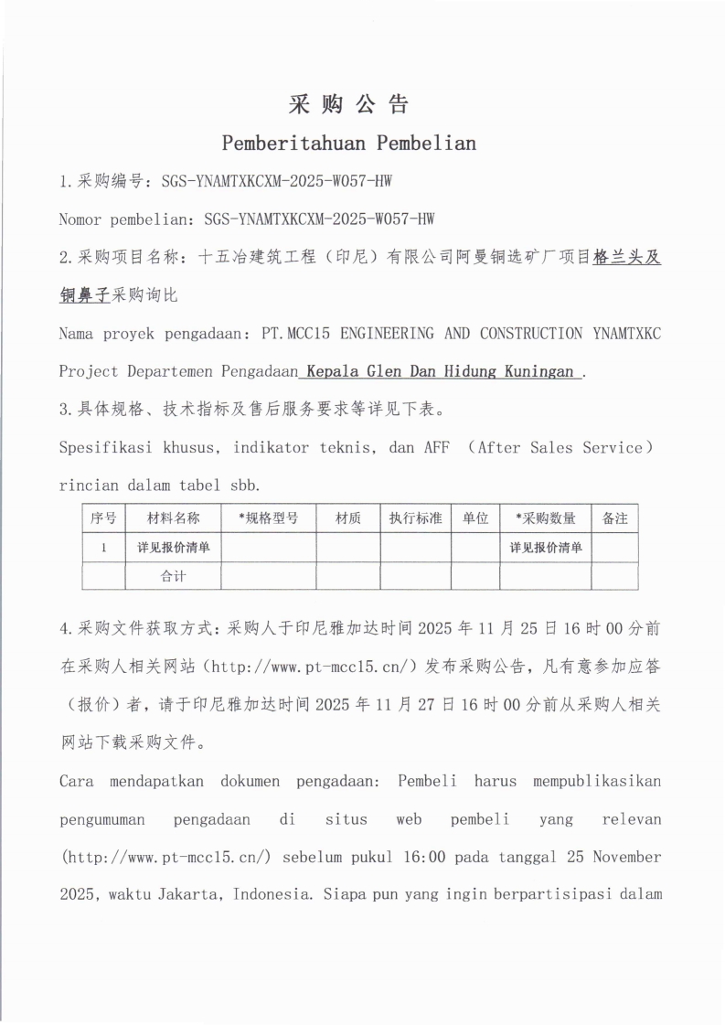 十五冶建筑工程(印尼)有限公司阿曼铜选矿厂项目格兰头及铜鼻子采购询比 编号:SGS-YNAMTXKCXM-2025-W057-HW