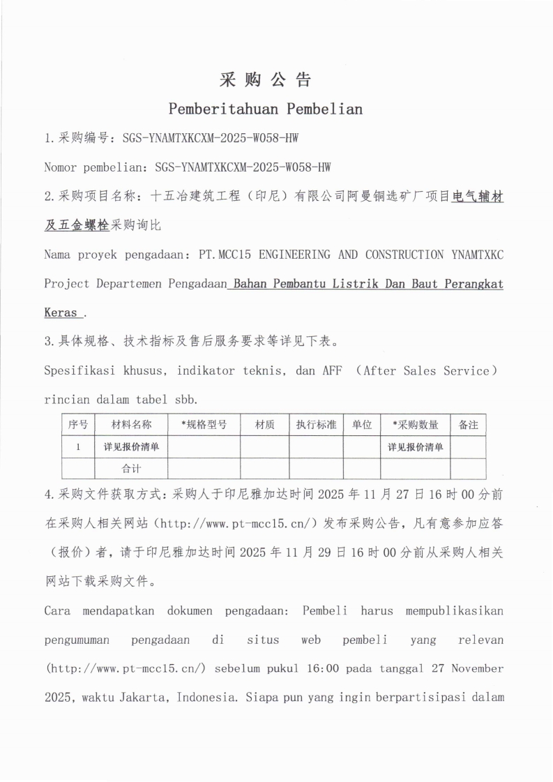十五冶建筑工程(印尼)有限公司阿曼铜选矿厂项目电气辅材及五金螺栓采购询比 编号:SGS-YNAMTXKCXM-2025-W058-HW