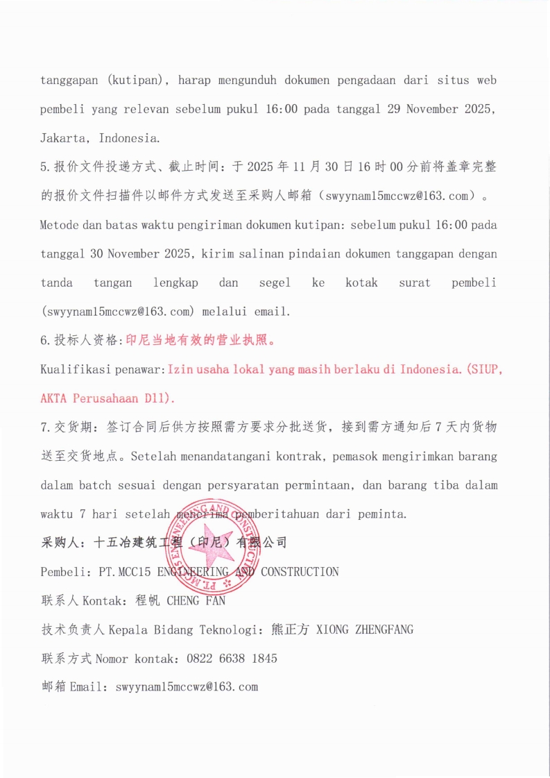 十五冶建筑工程 ( 印尼 ) 有限公司阿曼项目钢材采购询比公告