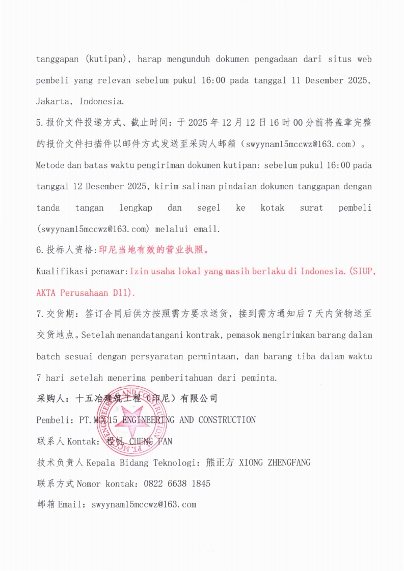十五冶建筑工程 ( 印尼 ) 有限公司阿曼项目钢材采购询比公告